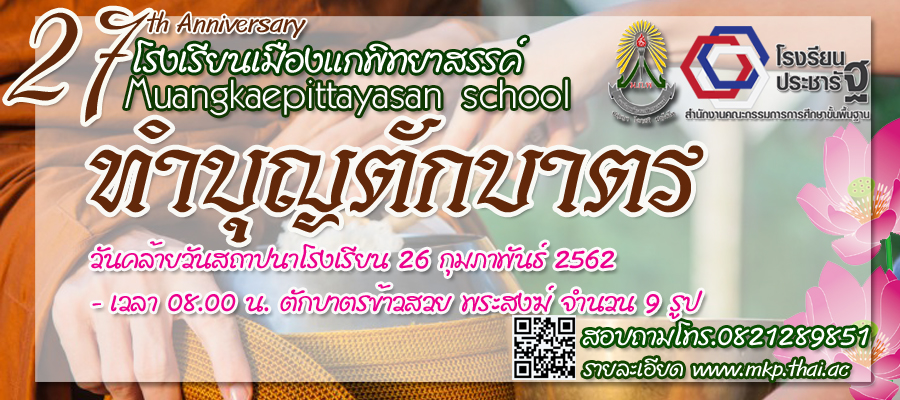 โรงเรียนเมืองแกพิทยาสรรค์ สพม.33 เชิญร่วมทำบุญตักบาตร พระสงฆ์ จำนวน 9 รูป เนื่องในวันคล้ายวันสถาปนาโรงเรียน ครบรอบ 27 ปี