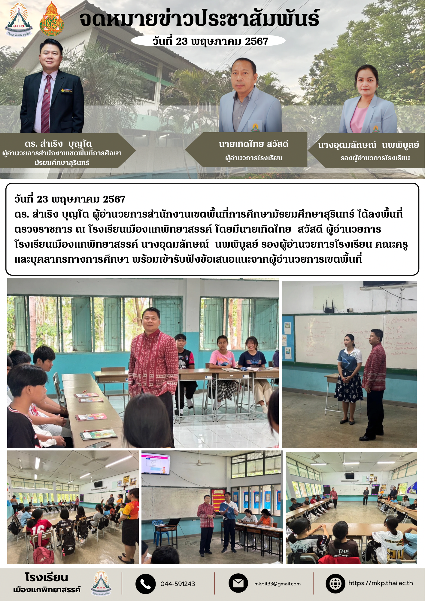 วันที่ 23 พฤษภาคม 2567 ดร. สำเริง บุญโต ผู้อำนวยการสำนักงานเขตพื้นที่การศึกษามัธยมศึกษาสุรินทร์ ได้ลงพื้นที่ตรวจราชการ ณ โรงเรียนเมืองแกพิทยาสรรค์ โดยมีนายเทิดไทย สวัสดี ผู้อำนวยการโรงเรียนเมืองแกพิ