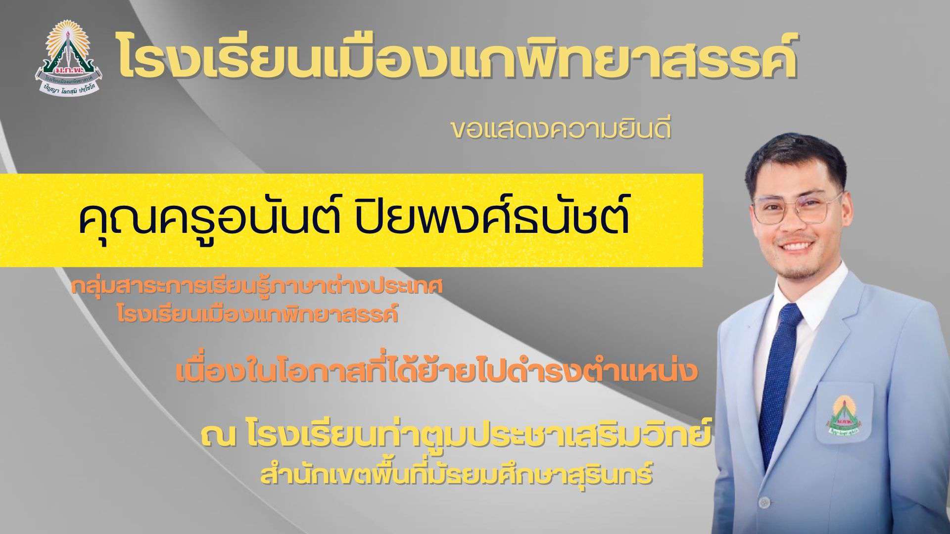 โรงเรียนเมืองแกพิทยาสรรค์ ขอแสดงความยินดีกับคุณครูอนันต์ ปิยพงศ์ธนัชต์ที่ได้ย้ายไปดำรงตำแหน่ง ณ โรงเรียนท่าตูมประชาเสริมวิทย์ ด้วยความยินดียี่ง