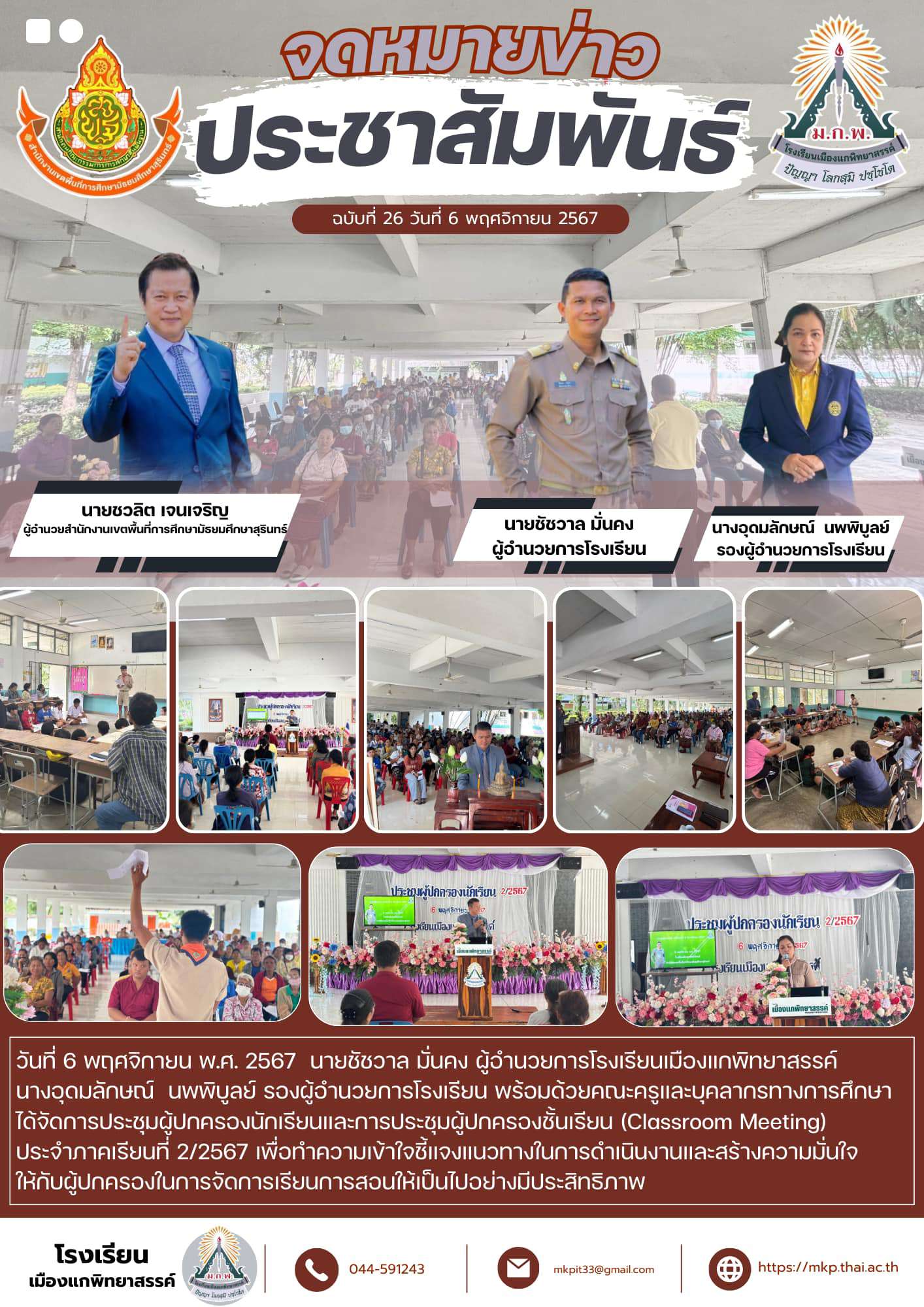 วันที่ 6 พฤศจิกายน พ.ศ. 2567 นายชัชวาล มั่นคง ผู้อำนวยการโรงเรียนเมืองแกพิทยาสรรค์ นางอุดมลักษณ์ นพพิบูลย์ รองผู้อำนวยการโรงเรียน พร้อมด้วยคณะครูและบุคลากรทางการศึกษา ได้จัดการประชุมผู้ปกครองนักเรียนแ