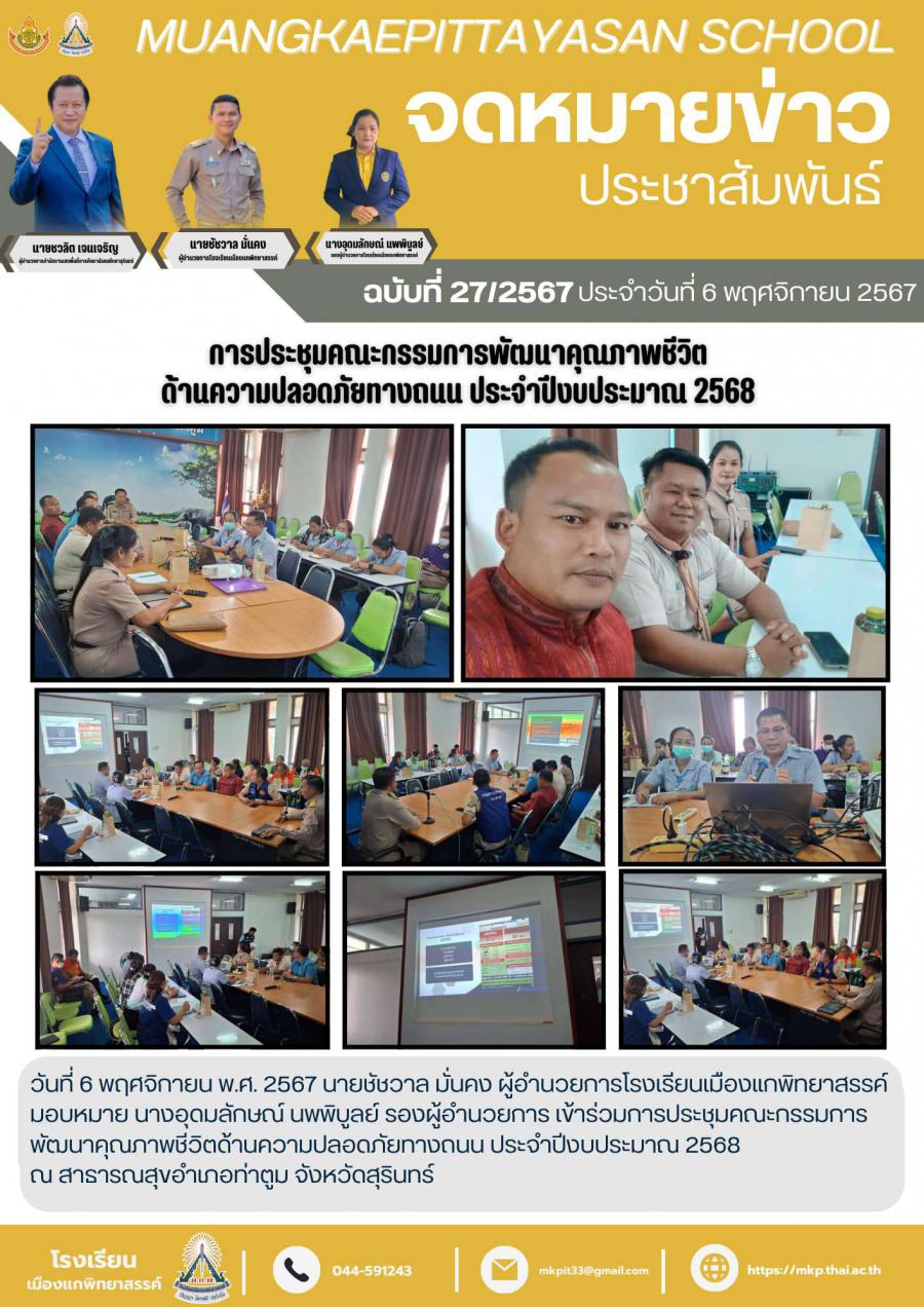 วันที่ 6 พฤศจิกายน พ.ศ. 2567 นายชัชวาล มั่นคง ผู้อำนวยการโรงเรียนเมืองแกพิทยาสรรค์ มอบหมาย นางอุดมลักษณ์ นพพิบูลย์ รองผู้อำนวยการ เข้าร่วมการประชุมคณะกรรมการพัฒนาคุณภาพชีวิตด้านความปลอดภัยทางถนน ประจำ