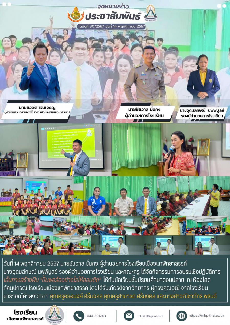 วันที่ 14 พฤศจิกายน 2567 นายชัชวาล มั่นคง ผู้อำนวยการโรงเรียนเมืองแกพิทยาสรรค์ นางอุดมลักษณ์ นพพิบูลย์ รองผู้อำนวยการโรงเรียน และคณะครู ได้จัดกิจกรรมการอบรมเชิงปฏิบัติการ เส้นทางสร้างฝัน ?ปั้นพอร์ตอย่