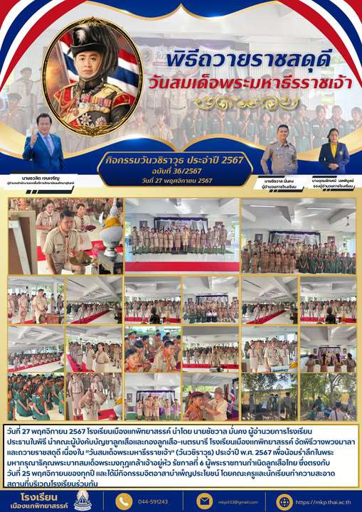 วันที่ 27 พฤศจิกายน 2567 โรงเรียนเมืองแกพิทยาสรรค์ นำโดย นายชัชวาล มั่นคง ผู้อำนวยการโรงเรียนประธานในพิธี นำคณะผู้บังคับบัญชาลูกเสือและกองลูกเสือ-เนตรนารี โรงเรียนเมืองแกพิทยาสรรค์ จัดพิธีวางพวงมาลาแล