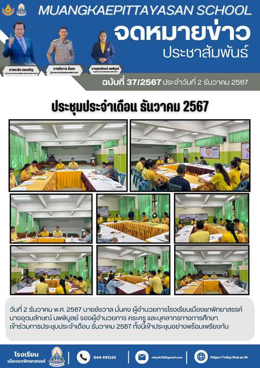 วันที่ 2 ธันวาคม พ.ศ. 2567 นายชัชวาล มั่นคง ผู้อำนวยการโรงเรียนเมืองแกพิทยาสรรค์ นางอุดมลักษณ์ นพพิบูลย์ รองผู้อำนวยการ คระครู และบุคลากรทางการศึกษา เข้าร่วมการประชุมประจำเดือน ธันวาคม 2567 ทั้งนี้เ