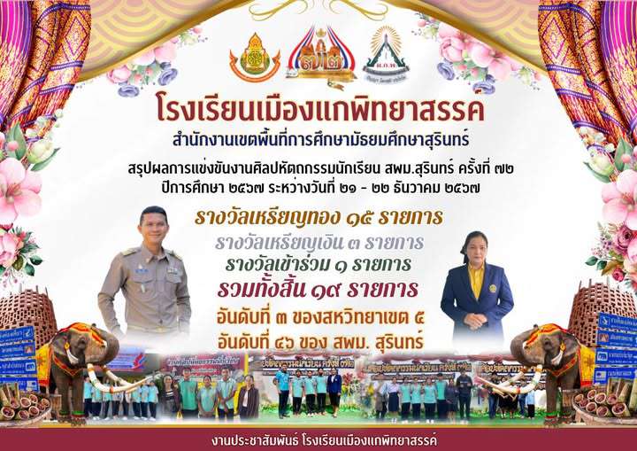 โรงเรียนเมืองแกพิทยาสรรค์ สรุปผลการแข่งขันงานศิลปหัตถกรรมนักเรียน สพม.สุรินทร์ ครั้งที่ ๗๒ ปีการศึกษา ๒๕๖๗ ระหว่างวันที่ ๒๑ - ๒๒ ธันวาคม ๒๕๖๗ โดยมีผลการแข่งขันดังนี้ ???? รางวัลเหรียญทอง ๑๕ รายการ ???