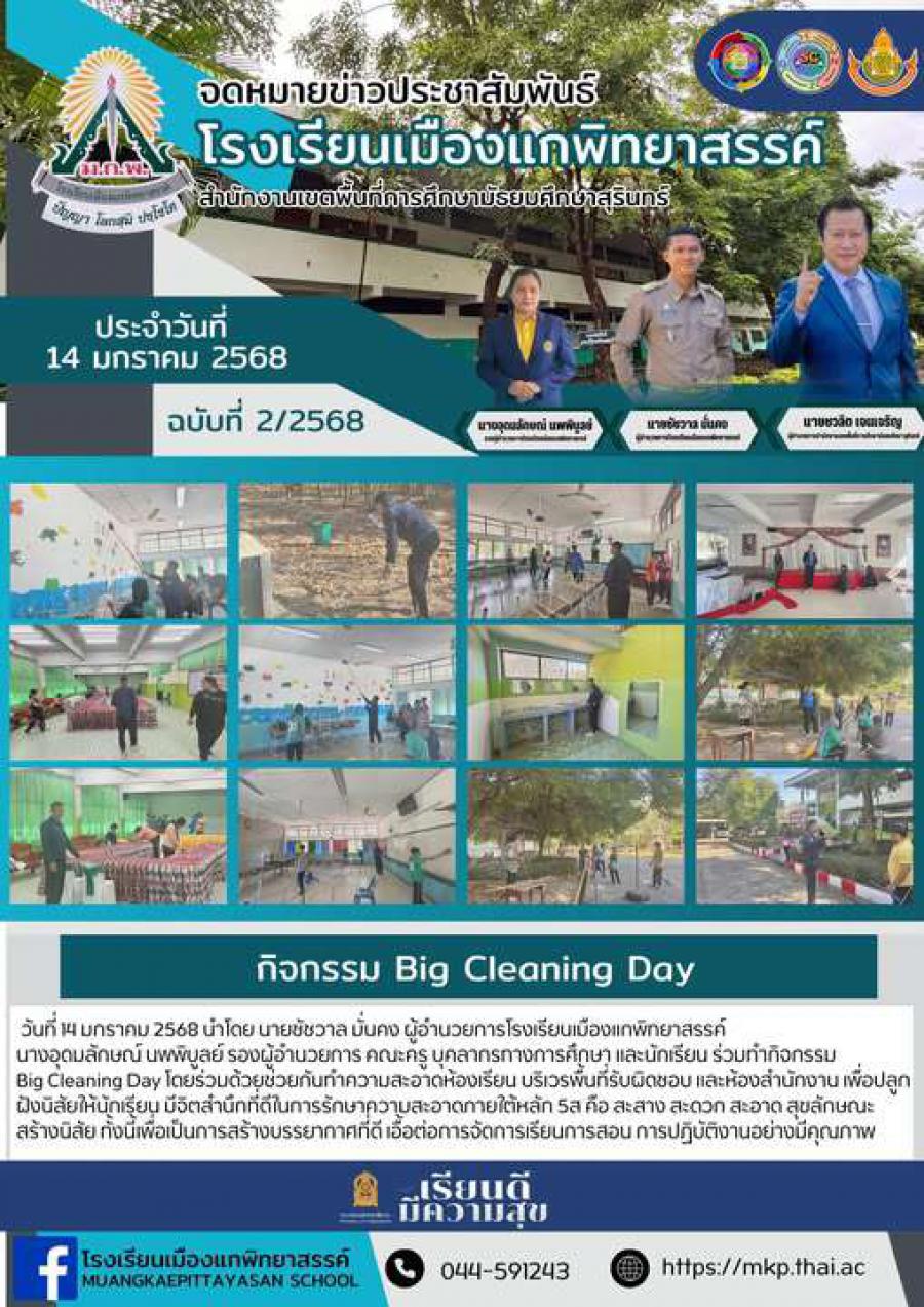 วันที่ 14 มกราคม 2568 นำโดย นายชัชวาล มั่นคง ผู้อำนวยการโรงเรียนเมืองแกพิทยาสรรค์ นางอุดมลักษณ์ นพพิบูลย์ รองผู้อำนวยการ คณะครู บุคลากรทางการศึกษา และนักเรียน ร่วมทำกิจกรรม Big Cleaning Day โดยร่วมด้ว