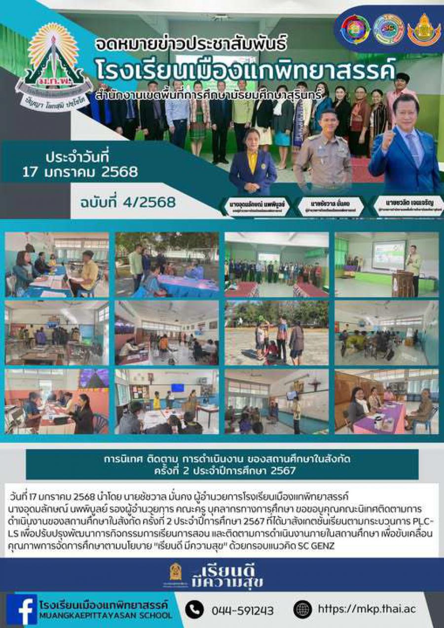 วันที่ 17 มกราคม 2568 นำโดย นายชัชวาล มั่นคง ผู้อำนวยการโรงเรียนเมืองแกพิทยาสรรค์ นางอุดมลักษณ์ นพพิบูลย์ รองผู้อำนวยการ คณะครู บุคลากรทางการศึกษา ขอขอบคุณคณะนิเทศติดตามการดำเนินงานของสถานศึกษาในสังก