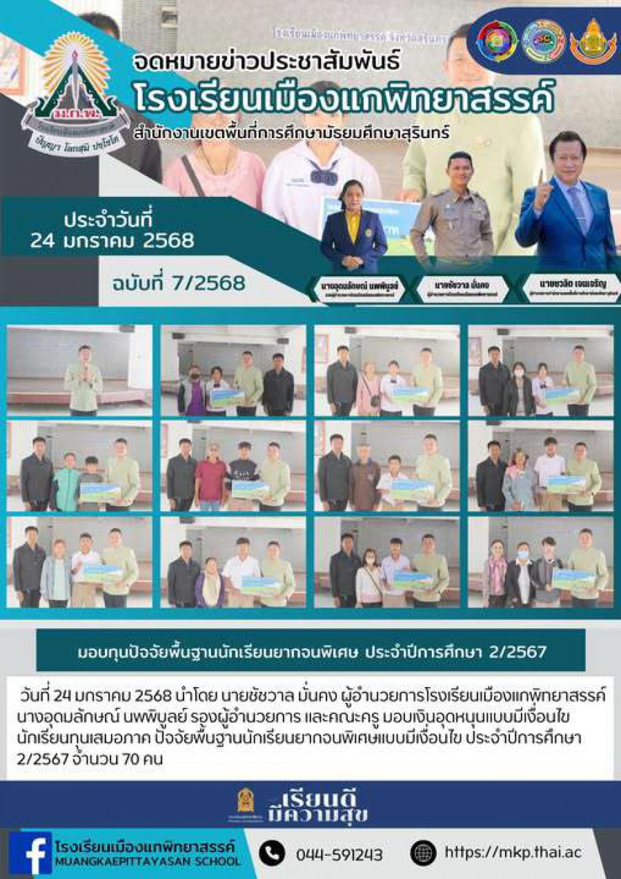 วันที่ 24 มกราคม 2568 นำโดย นายชัชวาล มั่นคง ผู้อำนวยการโรงเรียนเมืองแกพิทยาสรรค์ นางอุดมลักษณ์ นพพิบูลย์ รองผู้อำนวยการ และคณะครู มอบเงินอุดหนุนแบบมีเงื่อนไข นักเรียนทุนเสมอภาค ปัจจัยพื้นฐานนักเรียน