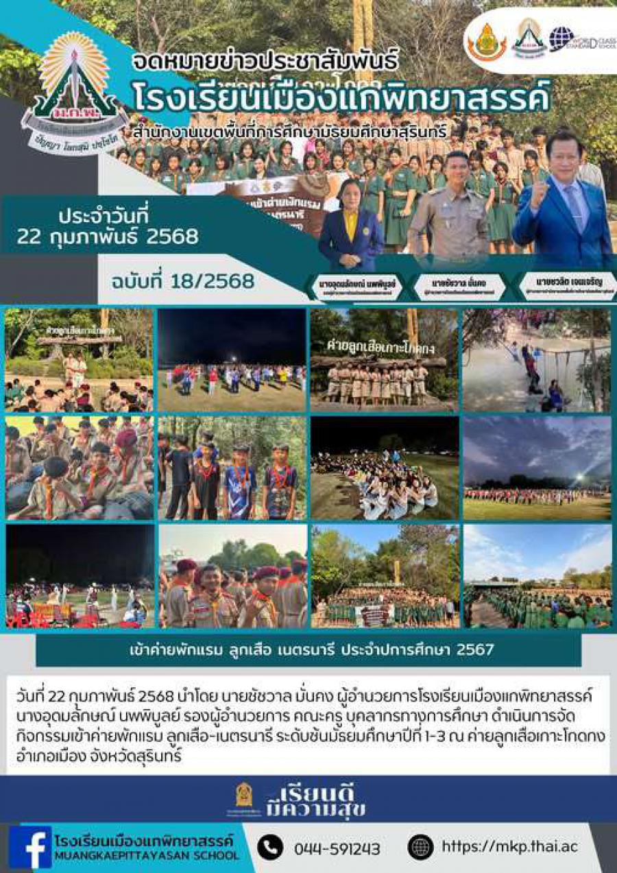 วันที่ 22 กุมภาพันธ์ 2568 นำโดย นายชัชวาล มั่นคง ผู้อำนวยการโรงเรียนเมืองแกพิทยาสรรค์ นางอุดมลักษณ์ นพพิบูลย์ รองผู้อำนวยการ คณะครู บุคลากรทางการศึกษา ดำเนินการจัดกิจกรรมเข้าค่ายพักแรม ลูกเสือ-เนตรนา