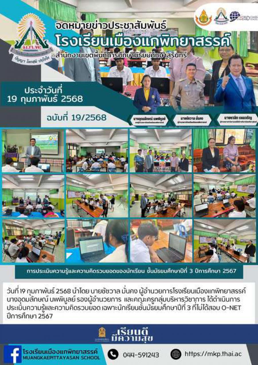 วันที่ 19 กุมภาพันธ์ 2568 นำโดย นายชัชวาล มั่นคง ผู้อำนวยการโรงเรียนเมืองแกพิทยาสรรค์ นางอุดมลักษณ์ นพพิบูลย์ รองผู้อำนวยการ และคณะครูกลุ่มบริหารวิชาการ ได้ดำเนินการประเมินความรู้และความคิดรวบยอด เฉ