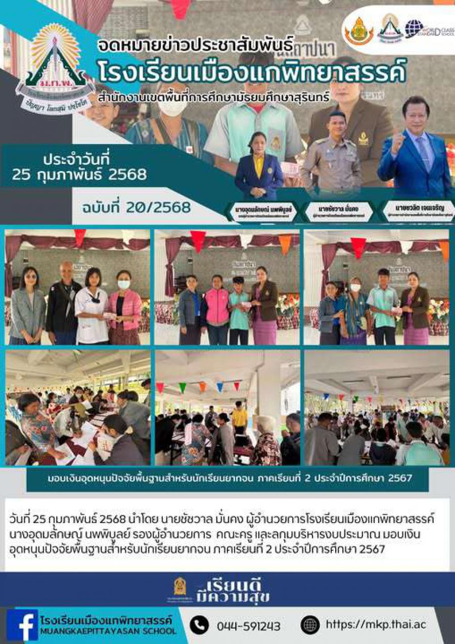 วันที่ 25 กุมภาพันธ์ 2568 นำโดย นายชัชวาล มั่นคง ผู้อำนวยการโรงเรียนเมืองแกพิทยาสรรค์ นางอุดมลักษณ์ นพพิบูลย์ รองผู้อำนวยการ คณะครู และกลุ่มบริหารงบประมาณ มอบเงินอุดหนุนปัจจัยพื้นฐานสำหรับนักเรียนยา