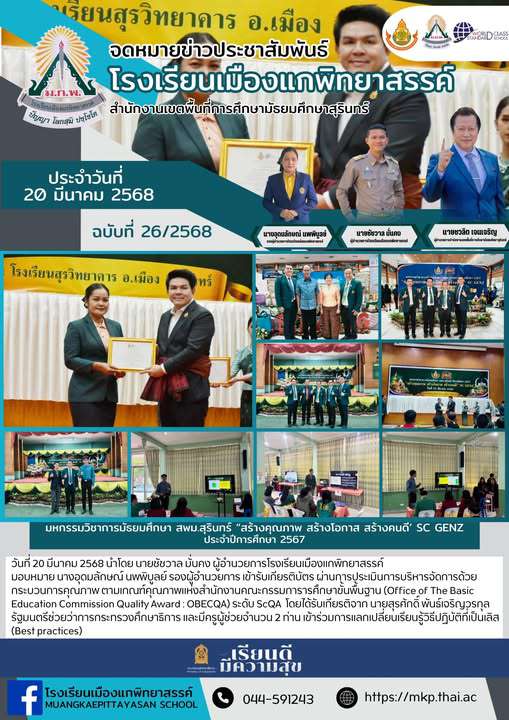 วันที่ 20 มีนาคม 2568 นำโดย นายชัชวาล มั่นคง ผู้อำนวยการโรงเรียนเมืองแกพิทยาสรรค์ มอบหมาย นางอุดมลักษณ์ นพพิบูลย์ รองผู้อำนวยการ เข้ารับเกียรติบัตร ผ่านการประเมินการบริหารจัดการด้วยกระบวนการคุณภาพ ตา