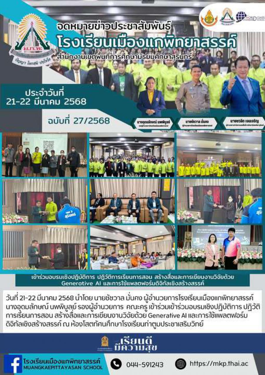 วันที่ 21-22 มีนาคม 2568 นำโดย นายชัชวาล มั่นคง ผู้อำนวยการโรงเรียนเมืองแกพิทยาสรรค์ นางอุดมลักษณ์ นพพิบูลย์ รองผู้อำนวยการ คณะครู เข้าร่วมเข้าร่วมอบรมเชิงปฏิบัติการ ปฏิวัติการเรียนการสอน สร้างสื่อแ