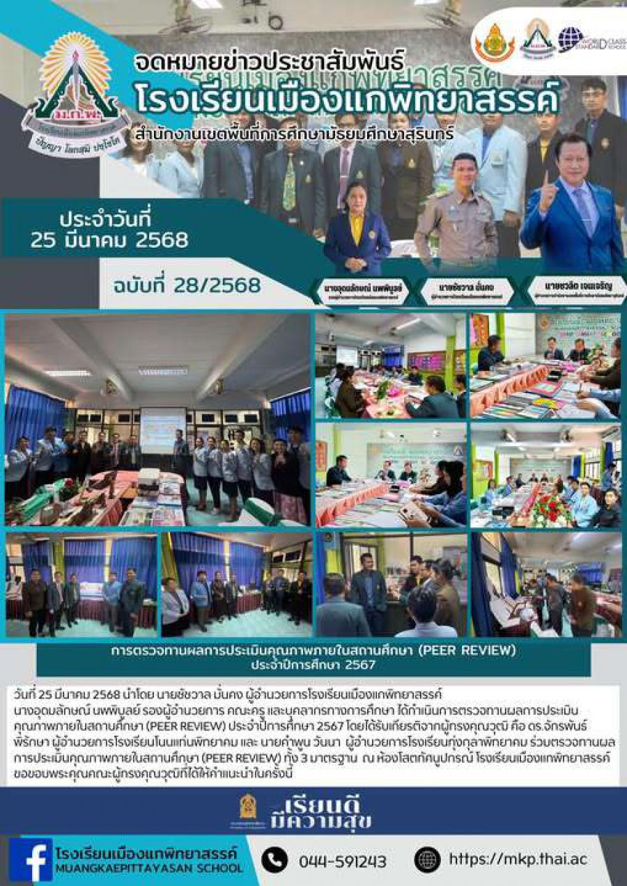 วันที่ 25 มีนาคม 2568 นำโดย นายชัชวาล มั่นคง ผู้อำนวยการโรงเรียนเมืองแกพิทยาสรรค์ นางอุดมลักษณ์ นพพิบูลย์ รองผู้อำนวยการ คณะครู และบุคลากรทางการศึกษา ได้กำเนินการตรวจทานผลการประเมินคุณภาพภายในสถานศึก