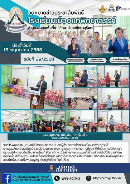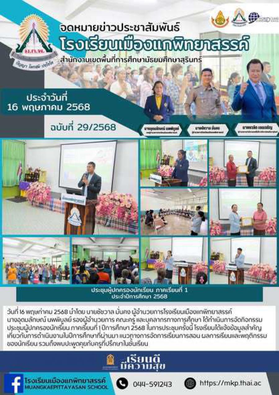 วันที่ 16 พฤษภ่าคม 2568 นำโดย นายชัชวาล มั่นคง ผู้อำนวยการโรงเรียนเมืองแกพิทยาสรรค์ นางอุดมลักษณ์ นพพิบูลย์ รองผู้อำนวยการ คณะครู และบุคลากรทางการศึกษา ได้กำเนินการจัดกิจกรรมประชุมผู้ปกครองนักเรียน ภ