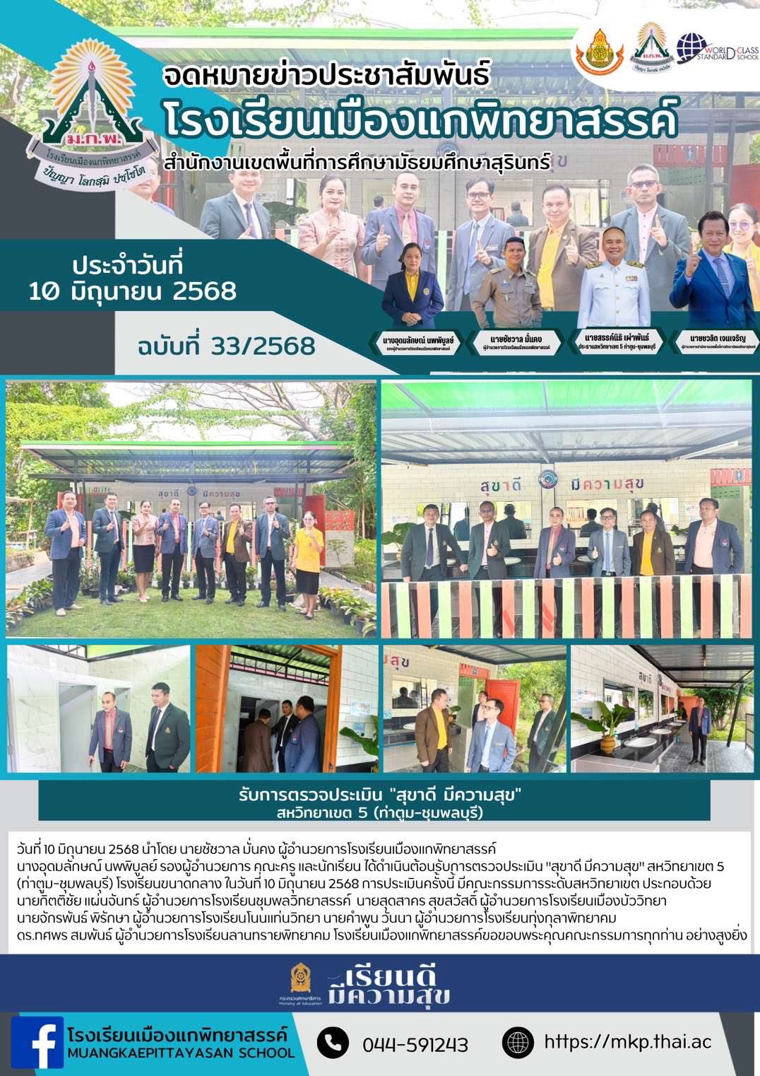 วันที่ 10 มิถุนายน 2568 นำโดย นายชัชวาล มั่นคง ผู้อำนวยการโรงเรียนเมืองแกพิทยาสรรค์ นางอุดมลักษณ์ นพพิบูลย์ รองผู้อำนวยการ คณะครู และนักเรียน ได้ดำเนินต้อนรับการตรวจประเมิน