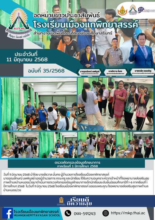 วันที่ 11 มิถุนายน 2568 นำโดย นายชัชวาล มั่นคง ผู้อำนวยการโรงเรียนเมืองแกพิทยาสรรค์ นางอุดมลักษณ์ นพพิบูลย์ รองผู้อำนวยการ คณะครู และนักเรียน ได้รับความอนุเคราะห์จากเจ้าหน้าที่โรงพยาบาลส่งเสริมสุขภาพ