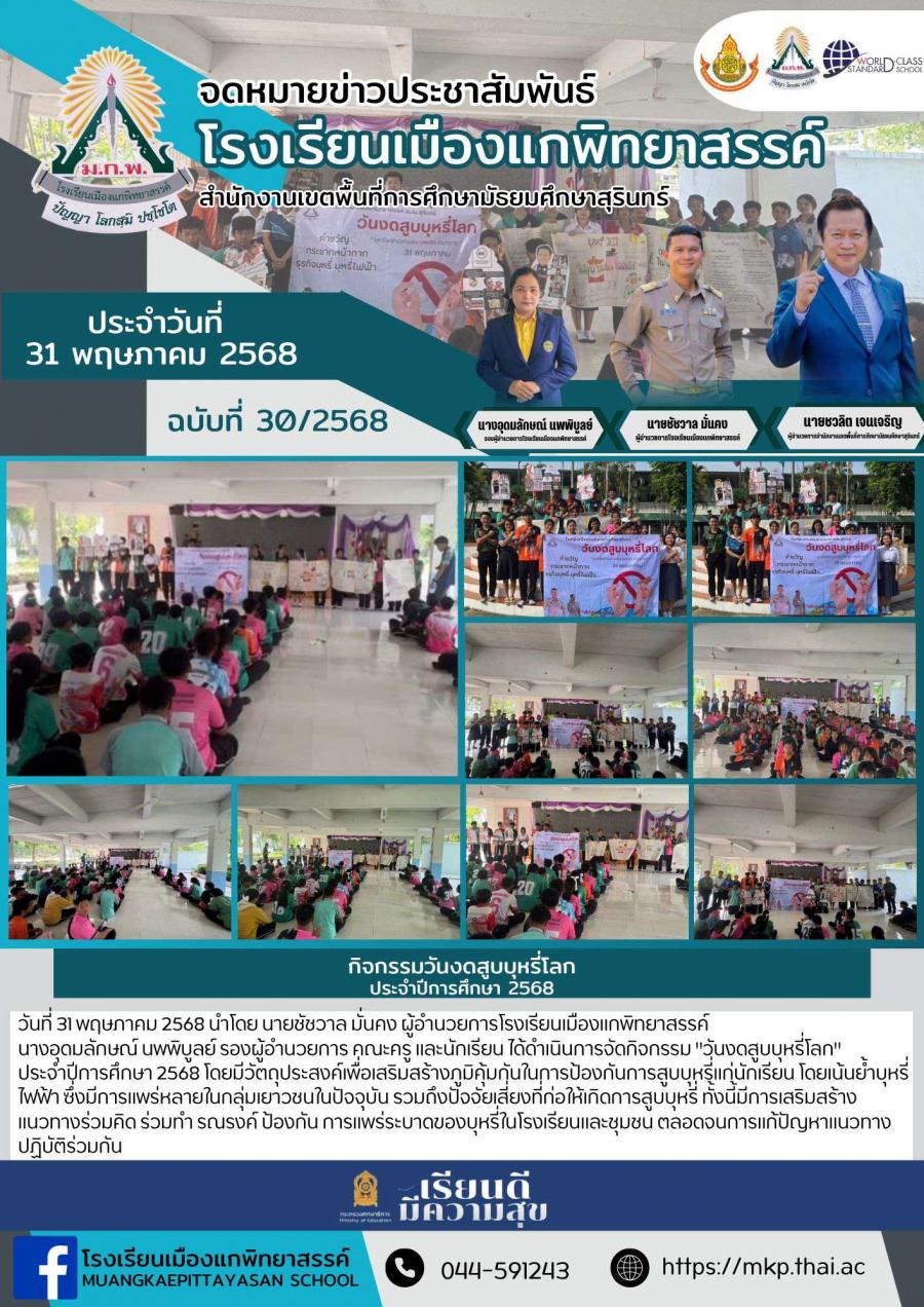 วันที่ 31 พฤษภาคม 2568 นำโดย นายชัชวาล มั่นคง ผู้อำนวยการโรงเรียนเมืองแกพิทยาสรรค์ นางอุดมลักษณ์ นพพิบูลย์ รองผู้อำนวยการ คณะครู และนักเรียน ได้ดำเนินการจัดกิจกรรม